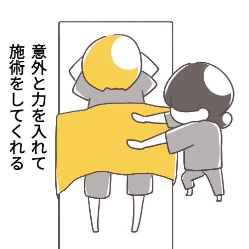 担当してくれたのは女性の方で結構力を入れてやってもらっているのですが、肩甲骨のあたりに全く指が入らない、、